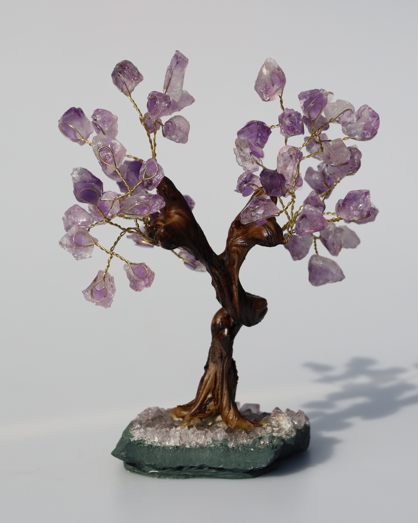 Dit geluksboompje is gemaakt met amethist kristallen als bladeren en staat op een natuurlijke basis van amethist. De amethist geeft dit boompje een extra bijzondere betekenis. Deze paarse edelsteen staat bekend om haar kalmerende en zuiverende energie en wordt geassocieerd met rust, heling en bescherming.