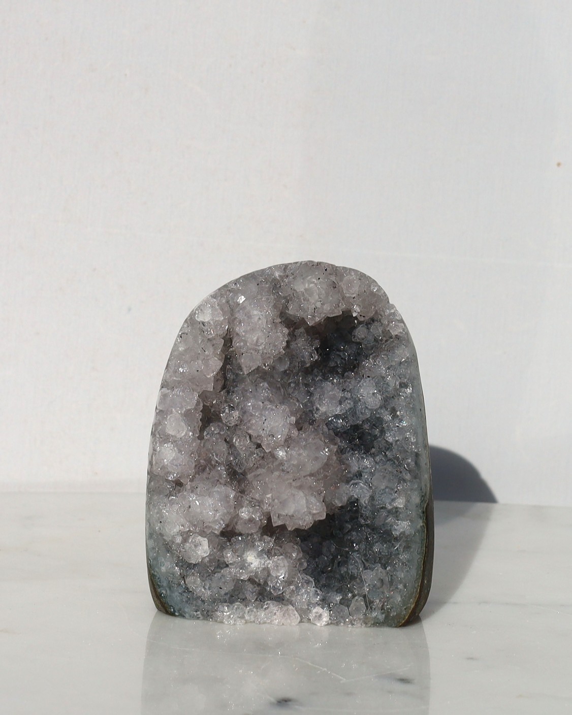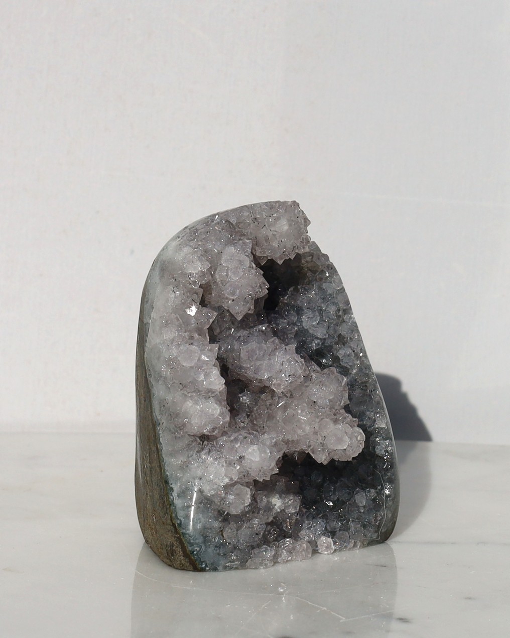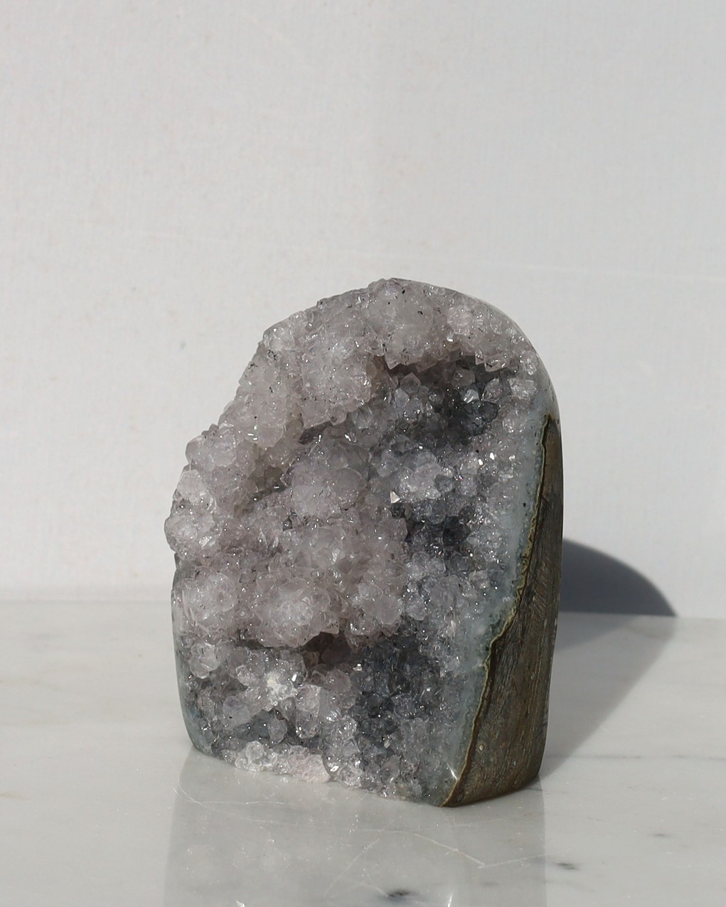 De paarse kleur van amethist ontstaat door sporen van ijzer in de kwartsstructuur, gecombineerd met natuurlijke straling uit de omgeving. Door deze straling veranderen de ijzerionen van toestand, waardoor de paarse tint ontstaat. De intensiteit van de kleur kan variëren van licht lavendel tot diep violet, afhankelijk van de hoeveelheid ijzer en de mate van blootstelling aan straling tijdens het groeiproces.