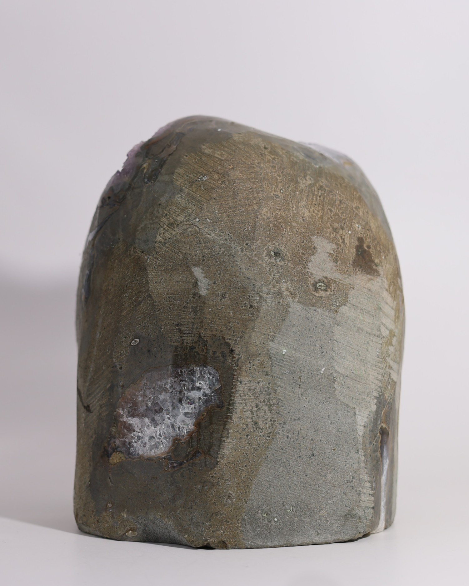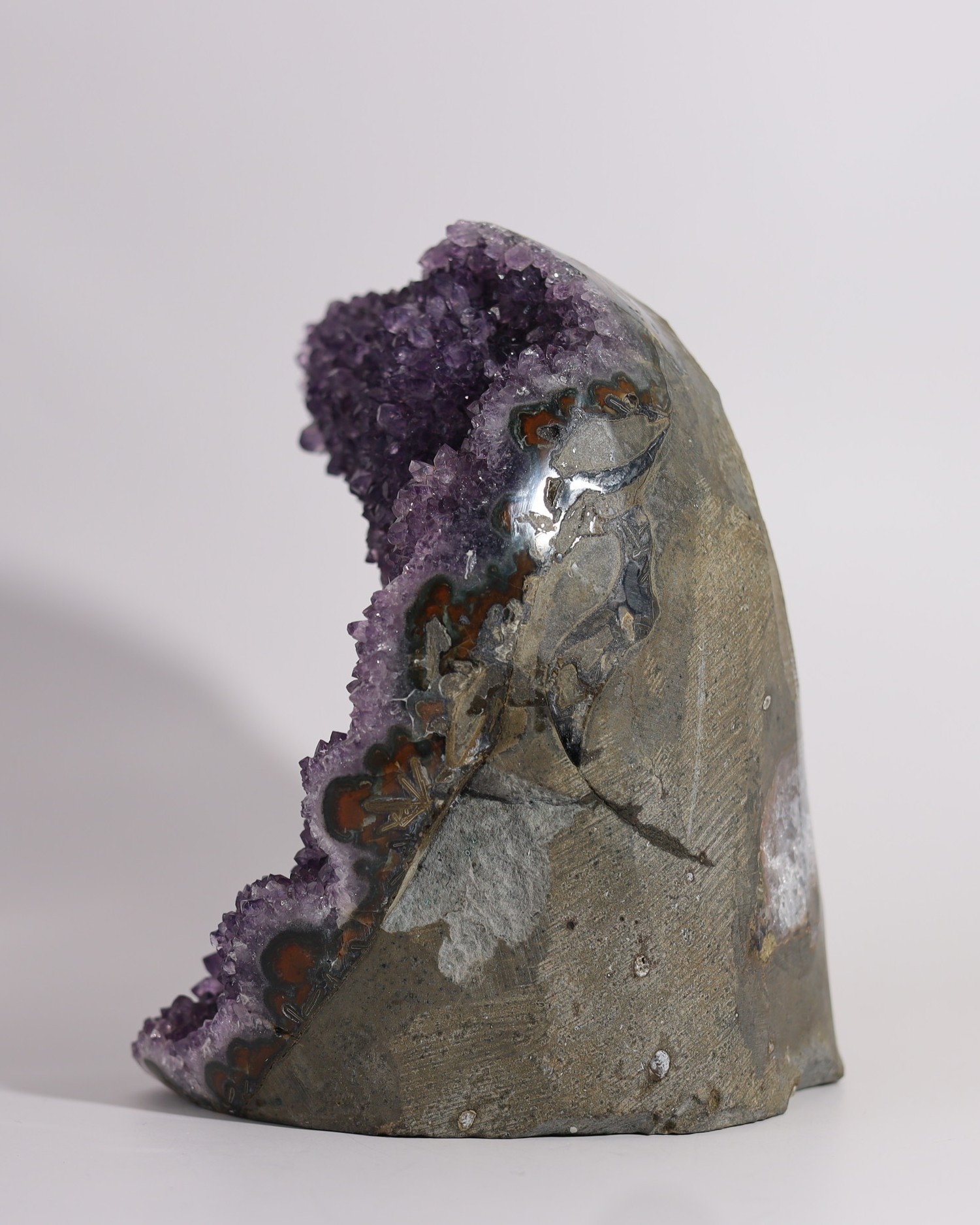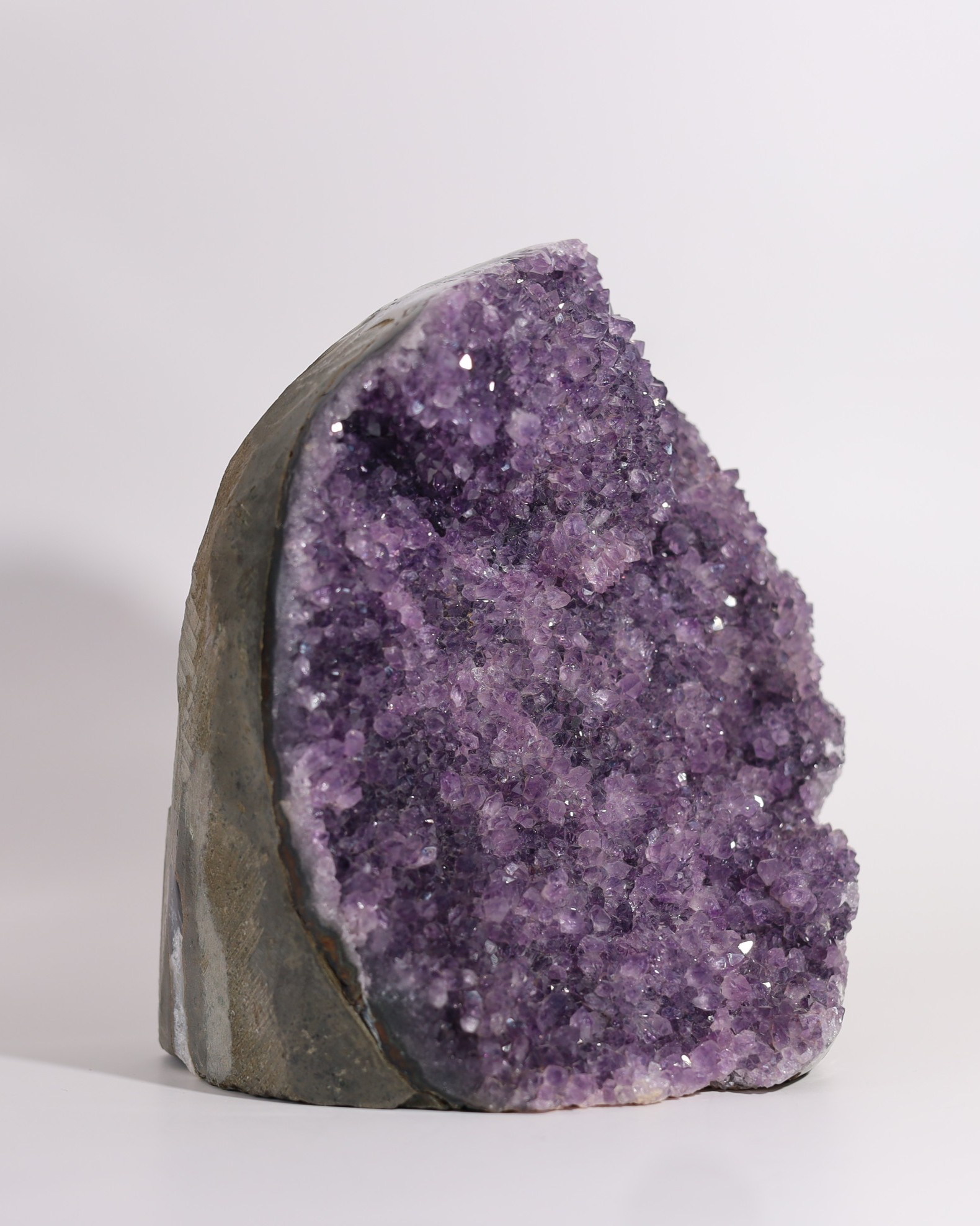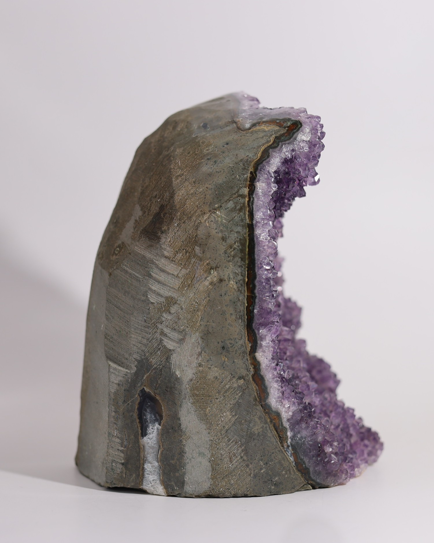 De paarse kleur van amethist ontstaat door sporen van ijzer in de kwartsstructuur, gecombineerd met natuurlijke straling uit de omgeving. Door deze straling veranderen de ijzerionen van toestand, waardoor de paarse tint ontstaat. De intensiteit van de kleur kan variëren van licht lavendel tot diep violet, afhankelijk van de hoeveelheid ijzer en de mate van blootstelling aan straling tijdens het groeiproces.