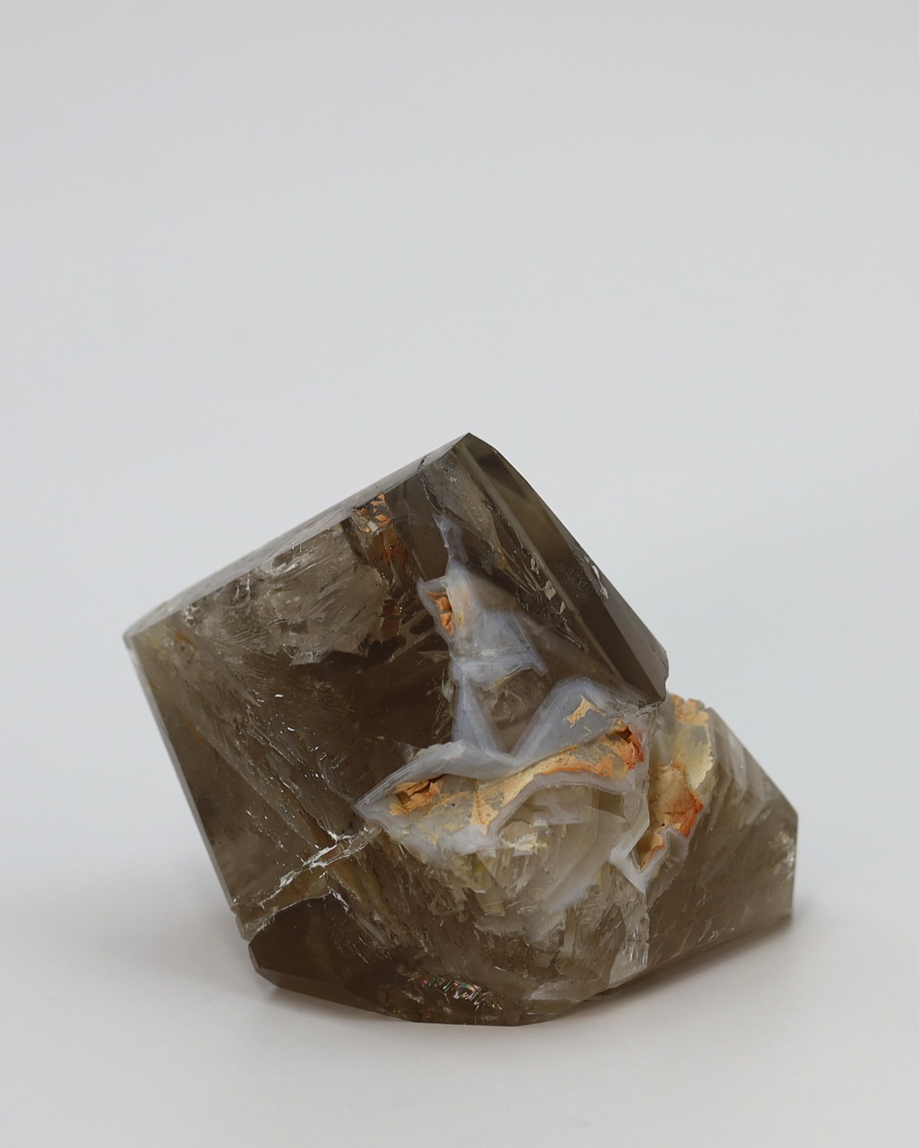 Dit type kristal vormt zich meestal in de latere fasen van hydrothermale systemen, wanneer de chemische samenstelling van de oplossing sterk schommelt en het kristal meerdere keren oplost en opnieuw uitkristalliseert. De naam elestiaal kwarts komt uit de kristallenhandel en verwijst naar het bijzondere, gelaagde uiterlijk van het kristal, met terrassen en kleine puntjes die ontstaan door herhaald oplossen en opnieuw aangroeien tijdens de vorming. Het gaat niet om een aparte mineraalsoort maar om een specifieke groeivorm van kwarts. Omdat het uiterlijk zo opvallend is, bestaan er meerdere handelsnamen naast elkaar, zoals skeletkwarts, jacarékwarts of alligator quartz — allemaal verwijzingen naar dezelfde trapsgewijze structuur die aan schubben of lagen doet denken.