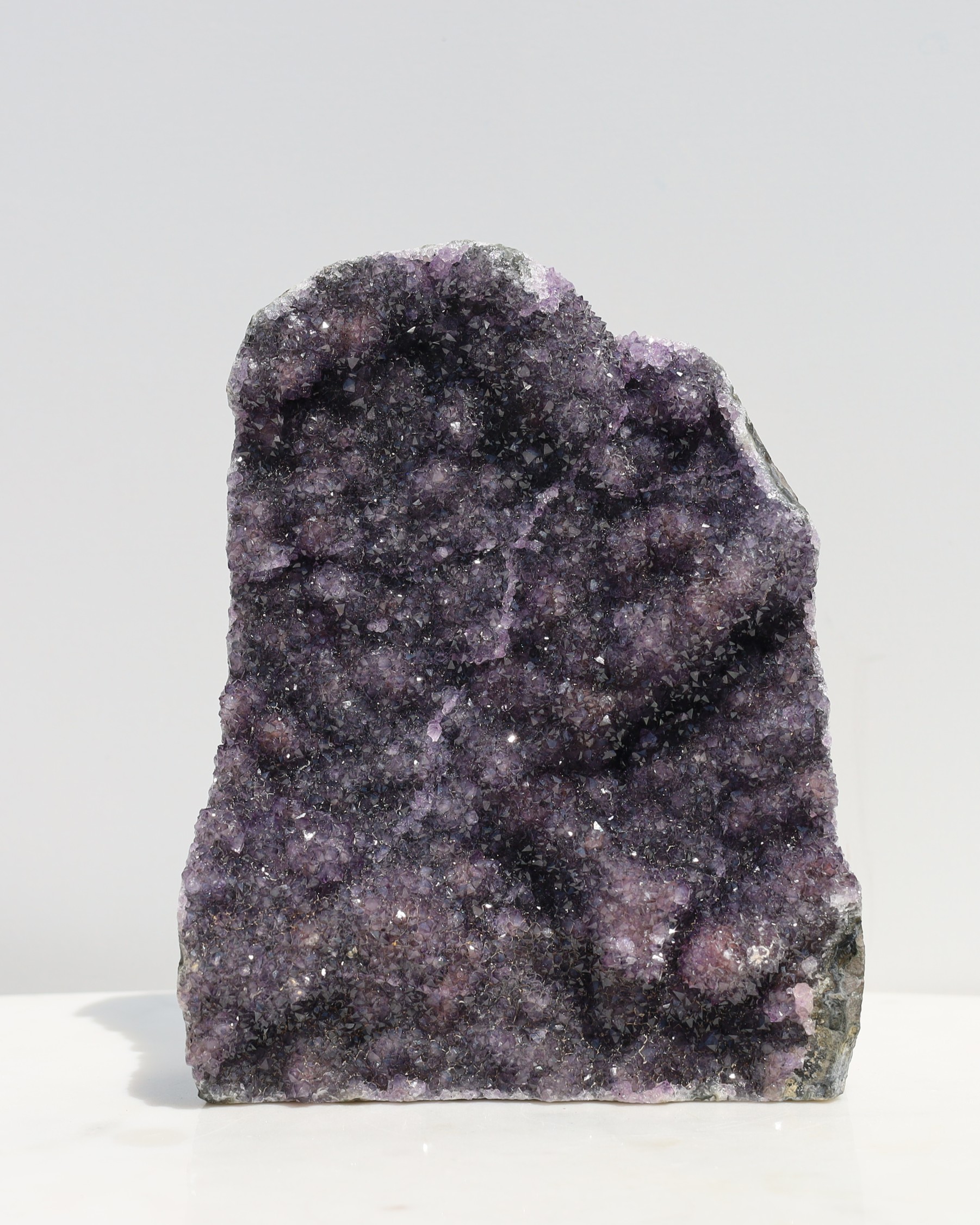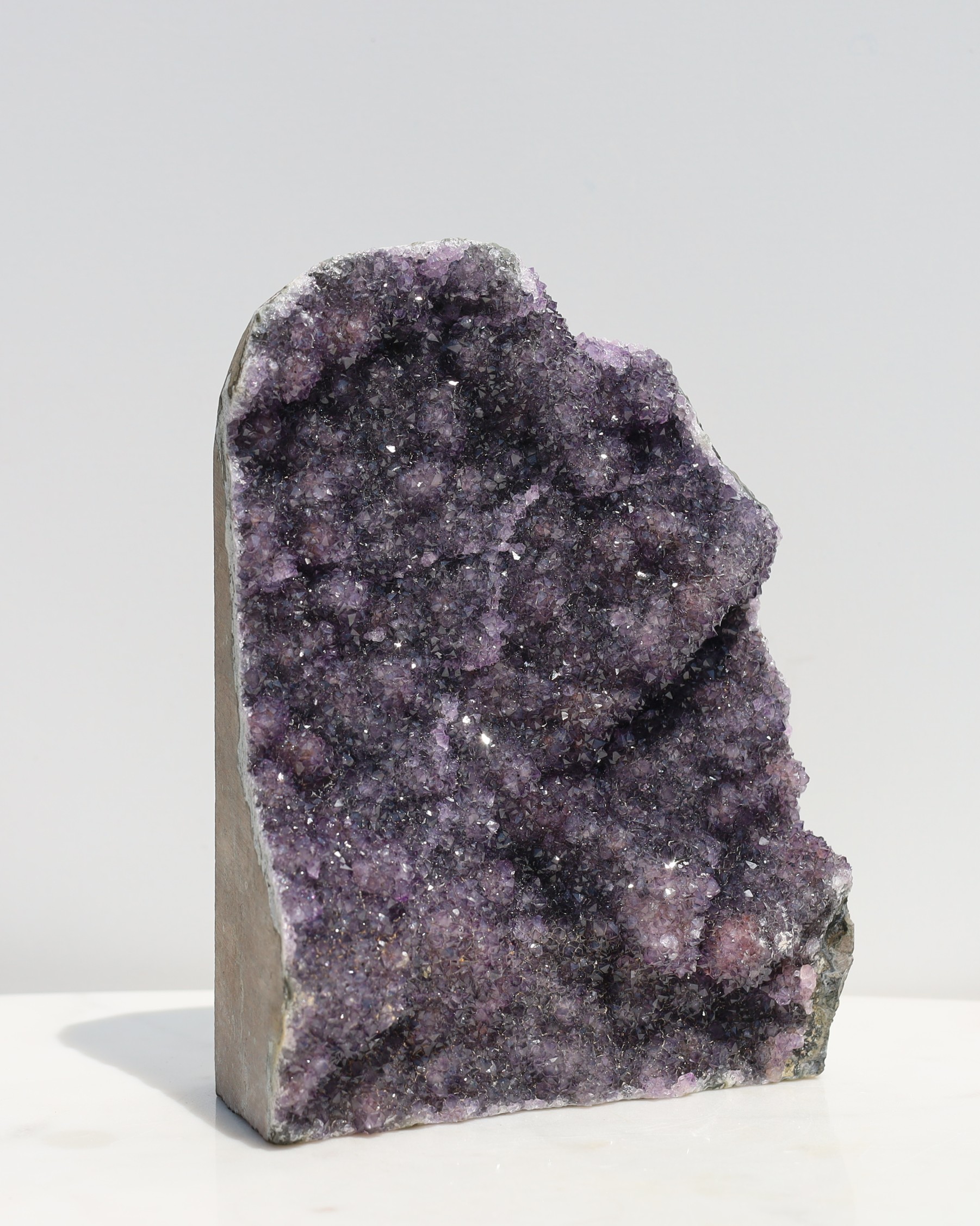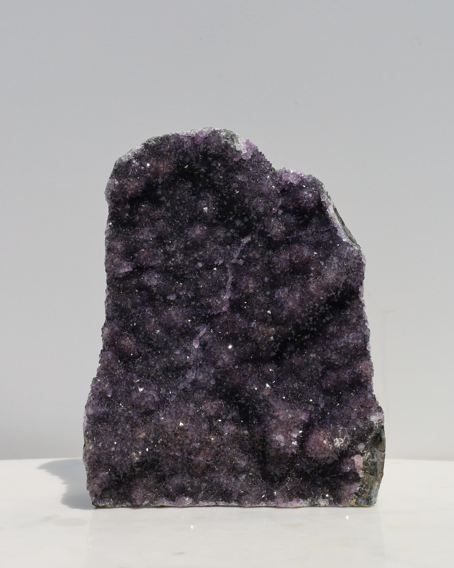 De paarse kleur van amethist ontstaat door sporen van ijzer in de kwartsstructuur, gecombineerd met natuurlijke straling uit de omgeving. Door deze straling veranderen de ijzerionen van toestand, waardoor de paarse tint ontstaat. De intensiteit van de kleur kan variëren van licht lavendel tot diep violet, afhankelijk van de hoeveelheid ijzer en de mate van blootstelling aan straling tijdens het groeiproces.