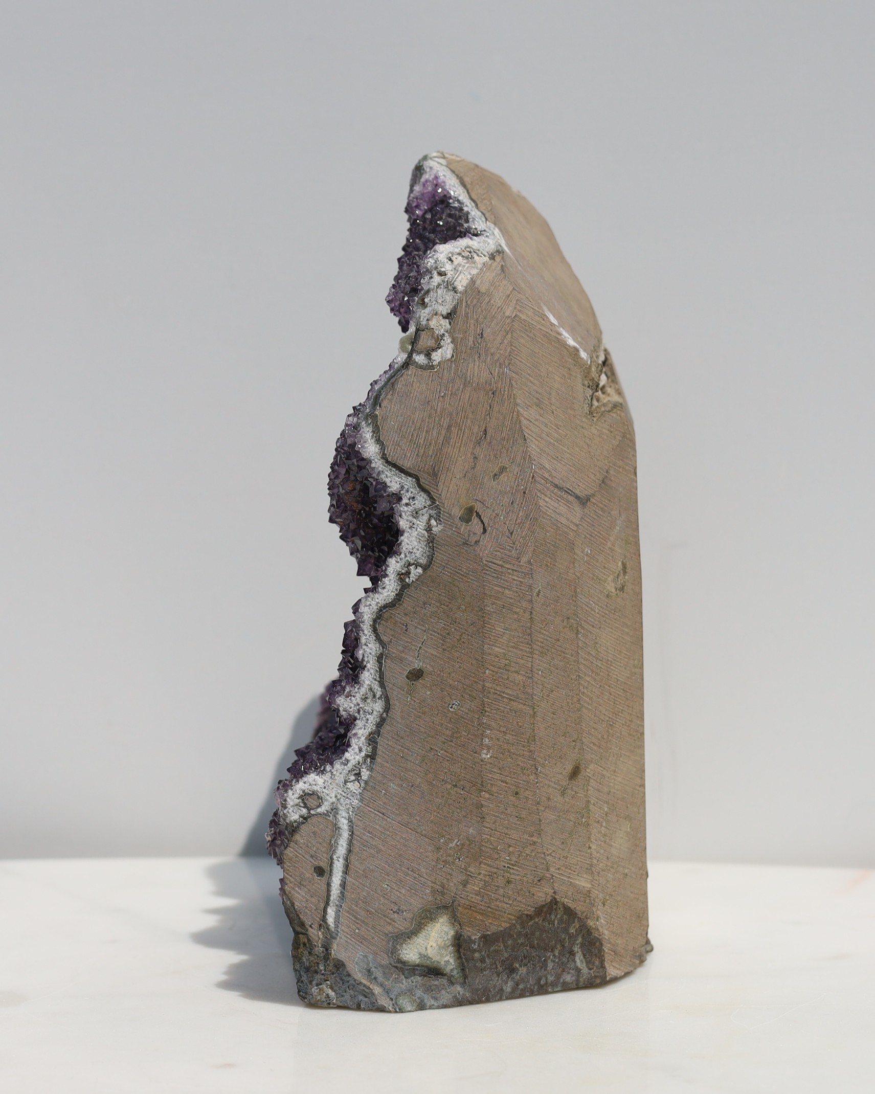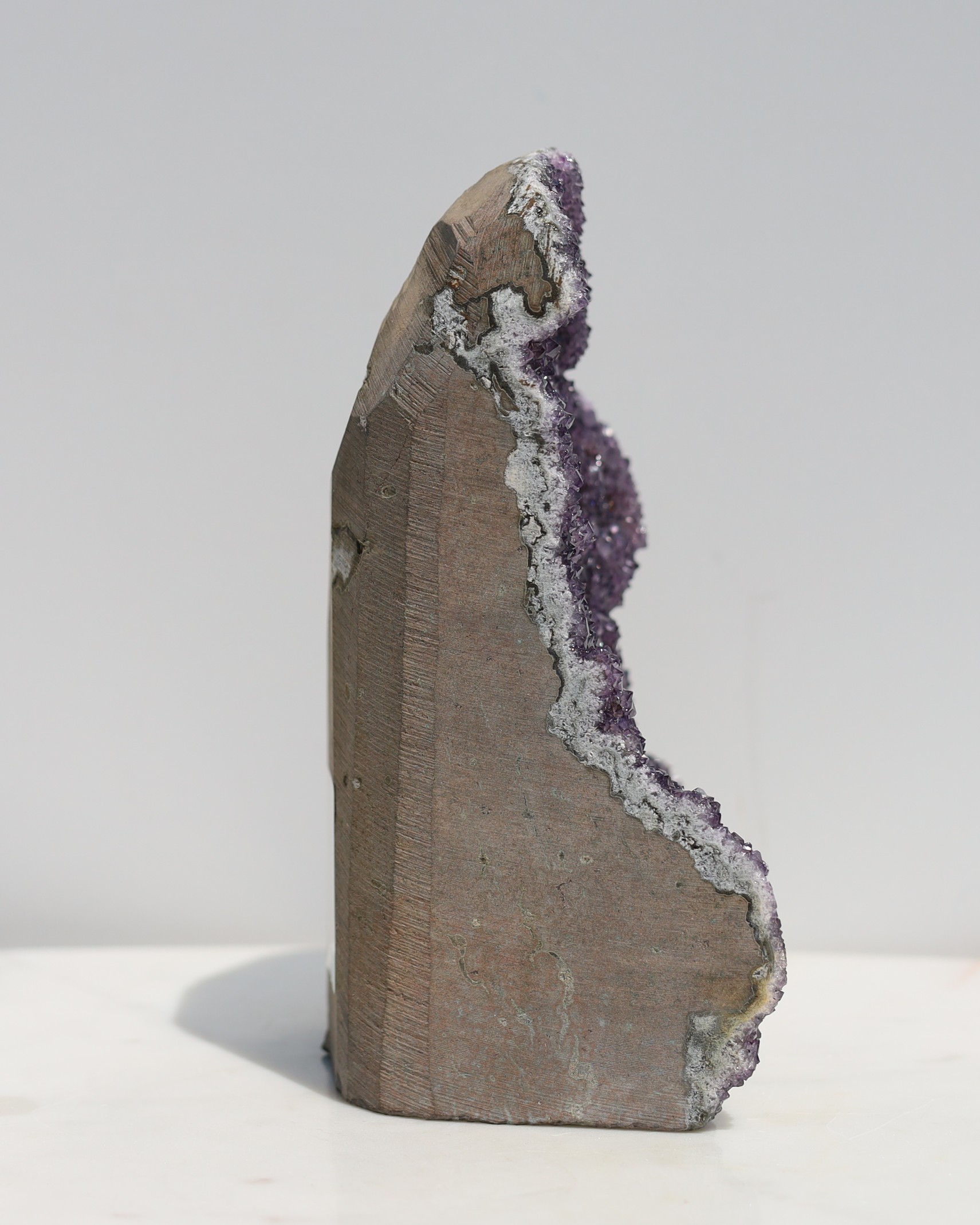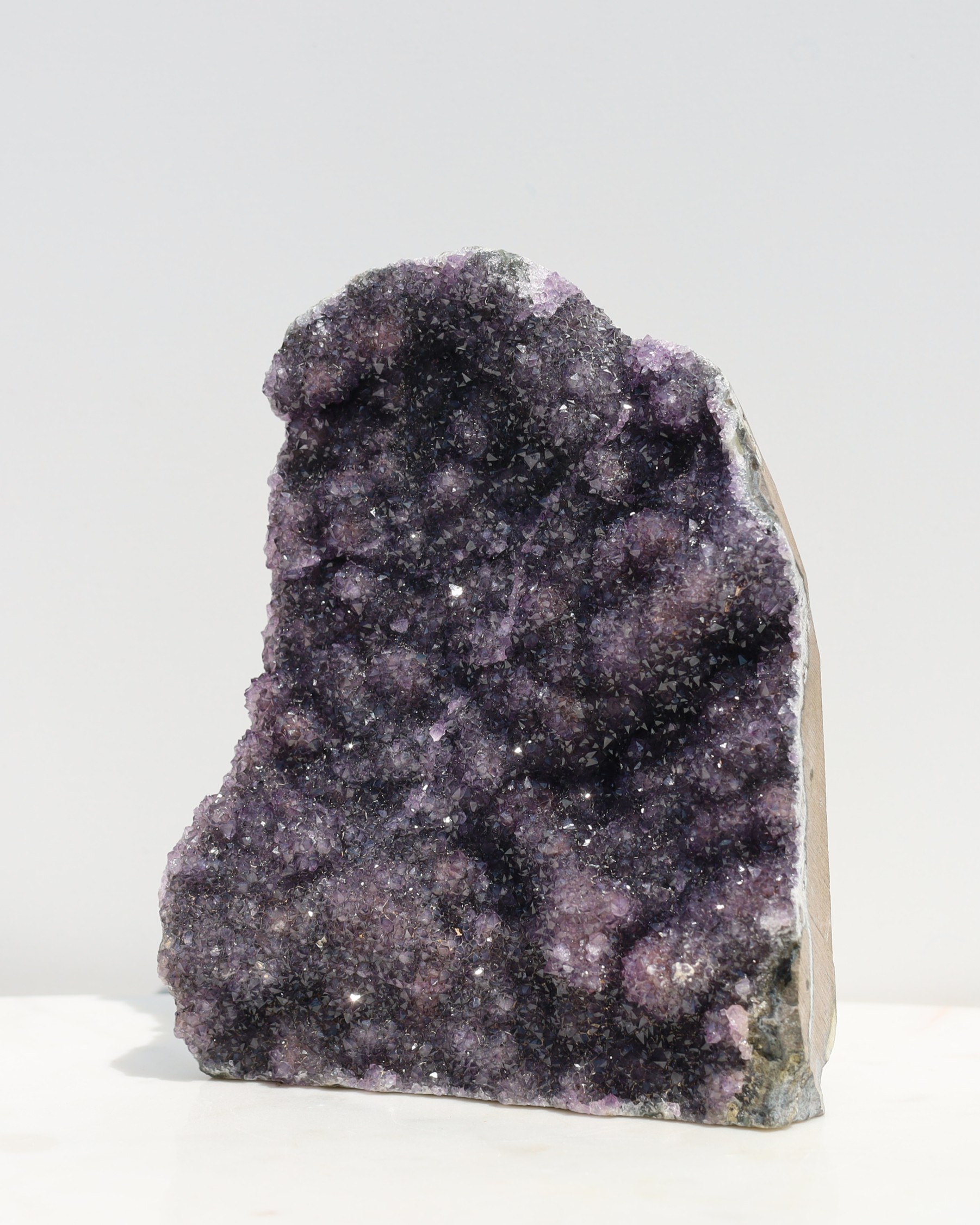De paarse kleur van amethist ontstaat door sporen van ijzer in de kwartsstructuur, gecombineerd met natuurlijke straling uit de omgeving. Door deze straling veranderen de ijzerionen van toestand, waardoor de paarse tint ontstaat. De intensiteit van de kleur kan variëren van licht lavendel tot diep violet, afhankelijk van de hoeveelheid ijzer en de mate van blootstelling aan straling tijdens het groeiproces.