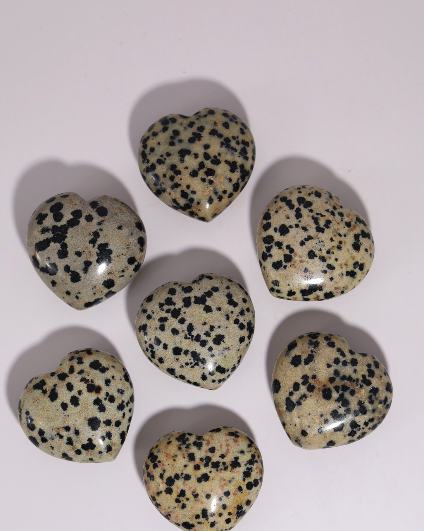 Dalmatierjaspis is een bijzondere variëteit van jaspis die zich onderscheidt door zijn lichte, crème- of beige achtergrond met opvallende zwarte of bruine stippen, die doen denken aan een dalmatiërhond. Deze stippen ontstaan door insluitsels van mineralen zoals tourmalijn of hematiet, terwijl gewone jaspis meestal egaal of gestreept is door gelijkmatig verspreide ijzer- of chlorietmineralen.