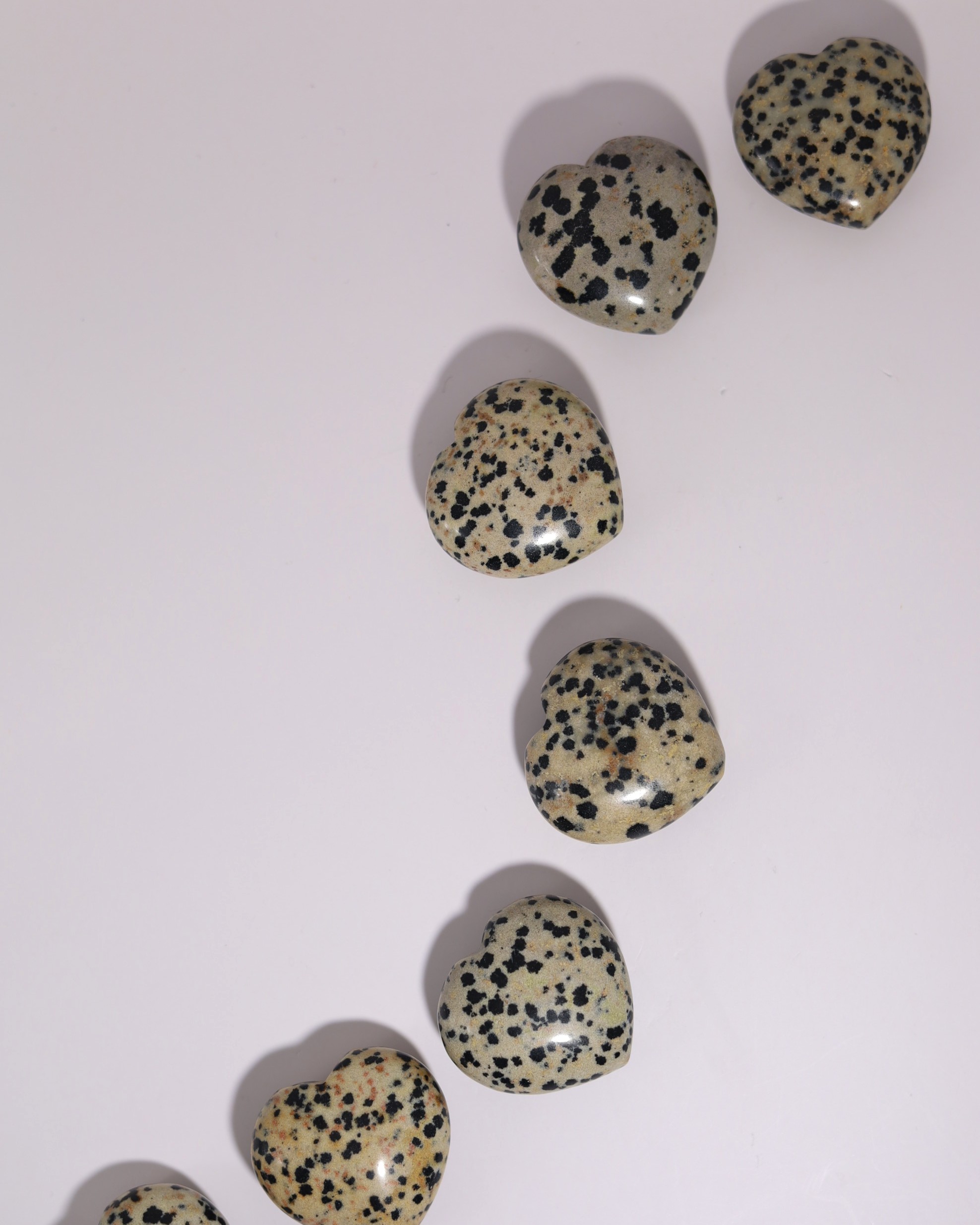 Jaspis is een krachtige, stabiliserende en aardende edelsteen die helpt bij het loslaten van stress, angst en negatieve gedachten. Hij bevordert innerlijke rust, harmonie en balans, en stimuleert een positieve kijk op het leven. Jaspis wordt ook gezien als een vitaliteitssteen, die emotioneel herstel ondersteunt en helpt bij het vinden van evenwicht tussen lichaam, geest en ziel. Hij werkt vooral op het wortelchakra, maar de specifieke energie kan per kleur van de steen iets verschillen. Dalmatierjaspis voegt hier een extra dimensie aan toe: dankzij de speelse stippenpatronen wordt hij geassocieerd met creativiteit, vrolijkheid en inspiratie.