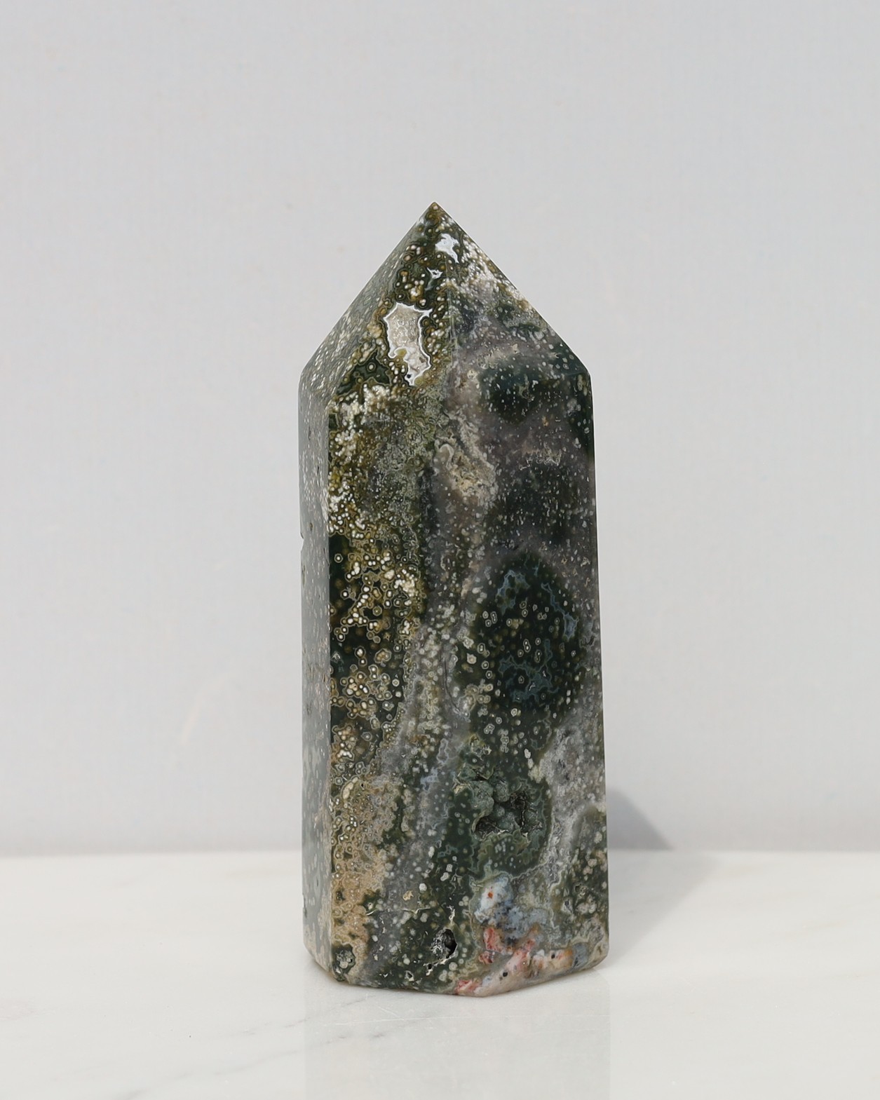Jaspis is een krachtige, stabiliserende en aardende edelsteen die helpt bij het loslaten van stress, angst en negatieve gedachten. Hij bevordert innerlijke rust, harmonie en balans, en stimuleert een positieve kijk op het leven. Jaspis wordt ook gezien als een vitaliteitssteen, die emotioneel herstel ondersteunt en helpt bij het vinden van evenwicht tussen lichaam, geest en ziel. Jaspis werkt vooral op het wortelchakra, maar de specifieke energie kan per kleur van de steen iets verschillen. Oceaan jaspis word geassocieerd met de zonnevlecht, hart en keelchakra. Het helpt je bewust te worden van het huidige moment en herinnert je eraan waar en van wie je écht houdt. De steen opent je voor de positieve aspecten van het leven en moedigt je aan te waarderen wat je hebt, omdat dit niet vanzelfsprekend is. Tegelijkertijd helpt Oceaan Jaspis om zorgen over de toekomst los te laten en oude wrok of negatieve gevoelens over het verleden te verdrijven. Hij bevordert innerlijke rust, helderheid en een open, positieve houding ten opzichte van jezelf en anderen.