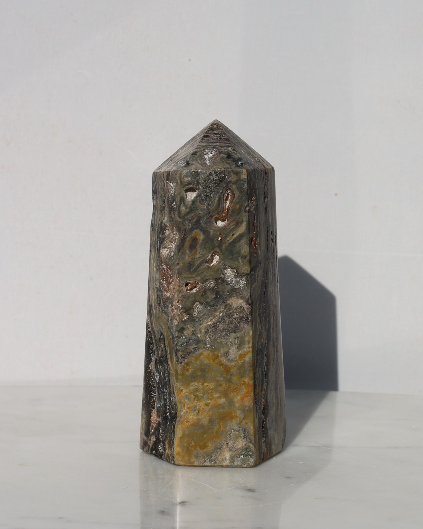 Jaspis is een krachtige, stabiliserende en aardende edelsteen die helpt bij het loslaten van stress, angst en negatieve gedachten. Hij bevordert innerlijke rust, harmonie en balans, en stimuleert een positieve kijk op het leven. Jaspis wordt ook gezien als een vitaliteitssteen, die emotioneel herstel ondersteunt en helpt bij het vinden van evenwicht tussen lichaam, geest en ziel. Jaspis werkt vooral op het wortelchakra, maar de specifieke energie kan per kleur van de steen iets verschillen. Oceaan jaspis word geassocieerd met de zonnevlecht, hart en keelchakra. Het helpt je bewust te worden van het huidige moment en herinnert je eraan waar en van wie je écht houdt. De steen opent je voor de positieve aspecten van het leven en moedigt je aan te waarderen wat je hebt, omdat dit niet vanzelfsprekend is. Tegelijkertijd helpt Oceaan Jaspis om zorgen over de toekomst los te laten en oude wrok of negatieve gevoelens over het verleden te verdrijven. Hij bevordert innerlijke rust, helderheid en een open, positieve houding ten opzichte van jezelf en anderen.