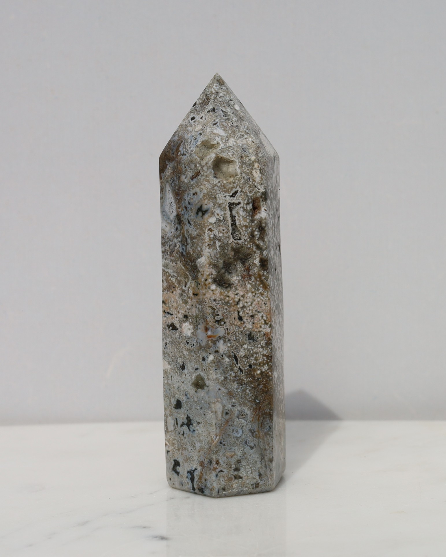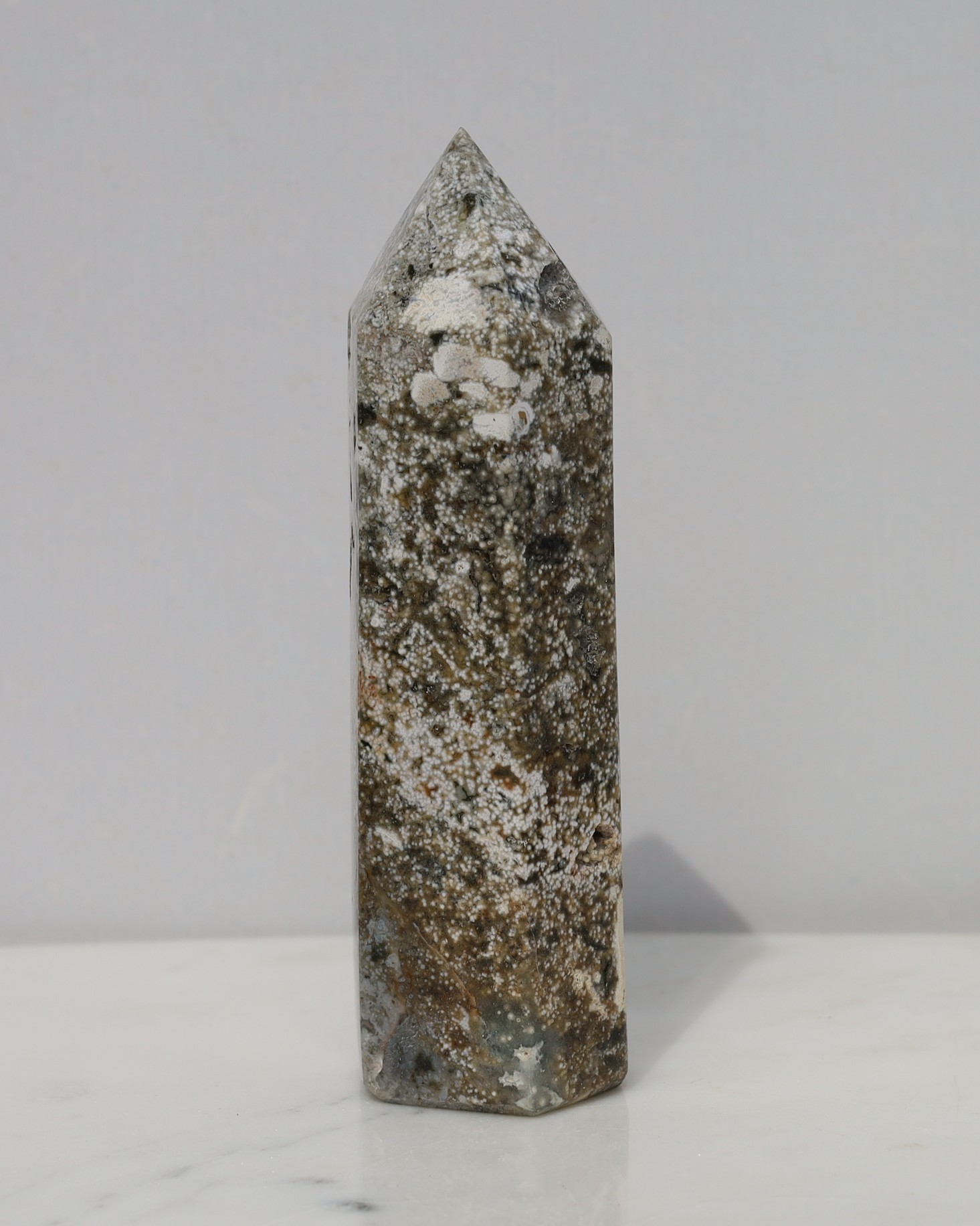 Jaspis is een krachtige, stabiliserende en aardende edelsteen die helpt bij het loslaten van stress, angst en negatieve gedachten. Hij bevordert innerlijke rust, harmonie en balans, en stimuleert een positieve kijk op het leven. Jaspis wordt ook gezien als een vitaliteitssteen, die emotioneel herstel ondersteunt en helpt bij het vinden van evenwicht tussen lichaam, geest en ziel. Jaspis werkt vooral op het wortelchakra, maar de specifieke energie kan per kleur van de steen iets verschillen. Oceaan jaspis word geassocieerd met de zonnevlecht, hart en keelchakra. Het helpt je bewust te worden van het huidige moment en herinnert je eraan waar en van wie je écht houdt. De steen opent je voor de positieve aspecten van het leven en moedigt je aan te waarderen wat je hebt, omdat dit niet vanzelfsprekend is. Tegelijkertijd helpt Oceaan Jaspis om zorgen over de toekomst los te laten en oude wrok of negatieve gevoelens over het verleden te verdrijven. Hij bevordert innerlijke rust, helderheid en een open, positieve houding ten opzichte van jezelf en anderen.