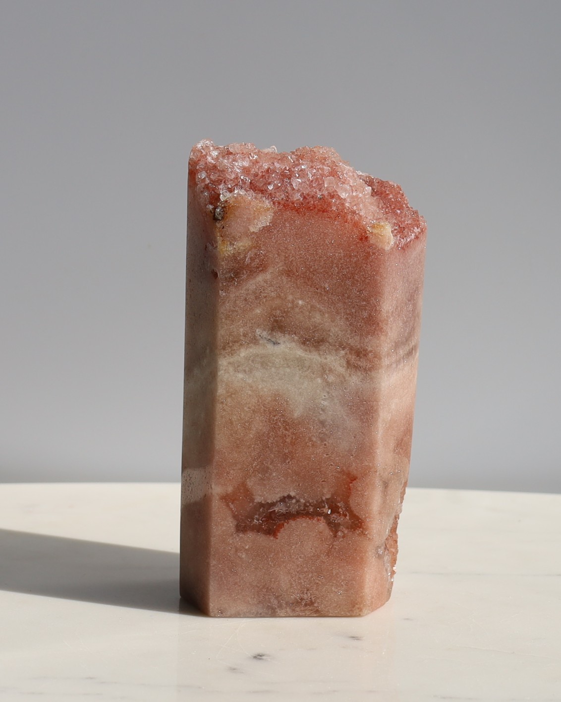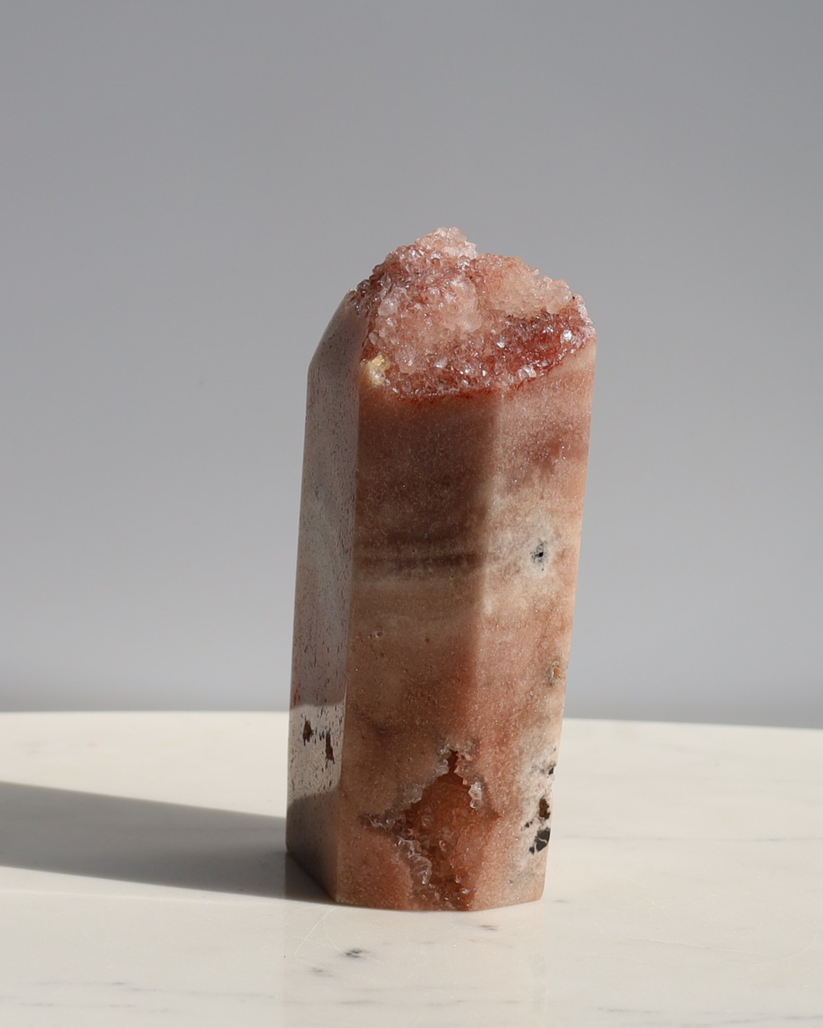 De naam “roze amethist” komt voort uit de visuele gelijkenis met gewone amethist: dezelfde kristalstructuur en dezelfde kwartsfamilie, maar dan in een roze kleur. Omdat het uiterlijk zo lijkt op amethist en de steen vaak in dezelfde vormen (clusters, geodes, puntjes) voorkomt, is de naam vanuit de edelsteenhandel blijven hangen.