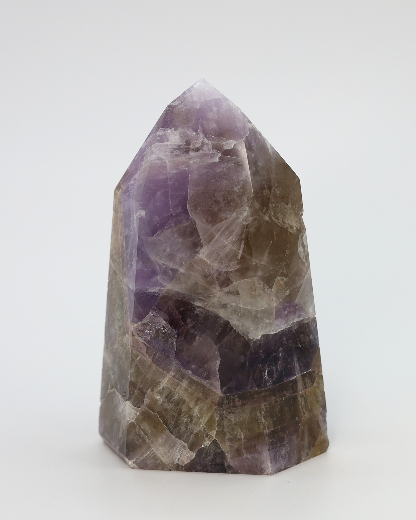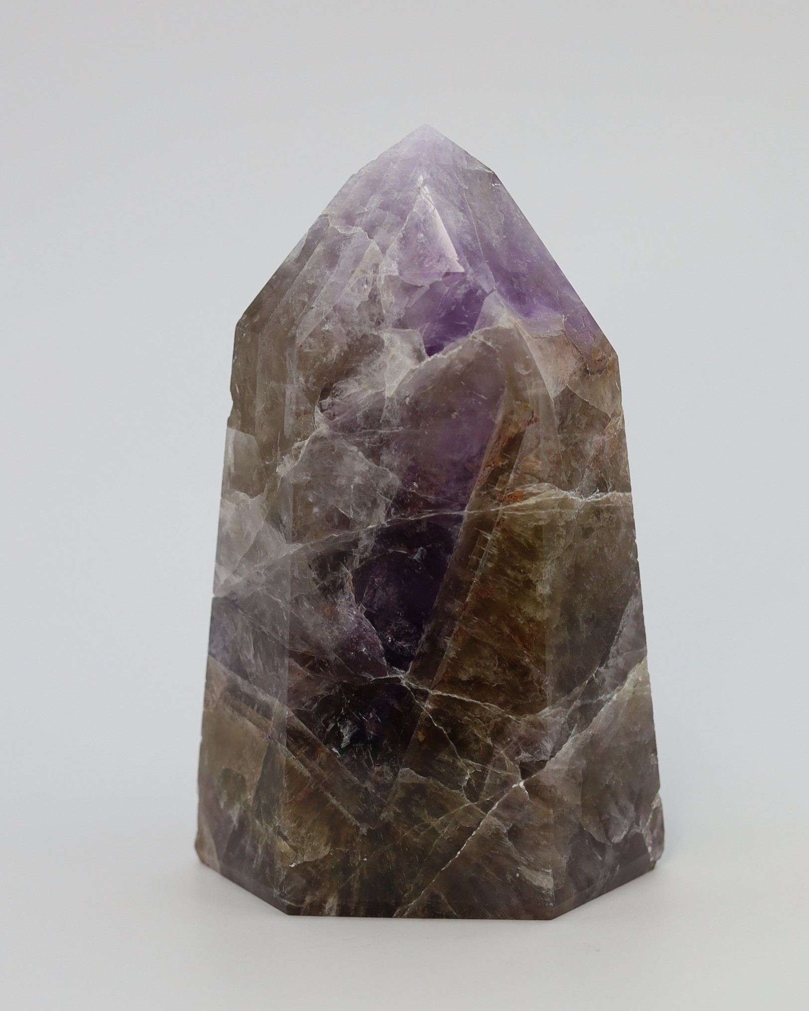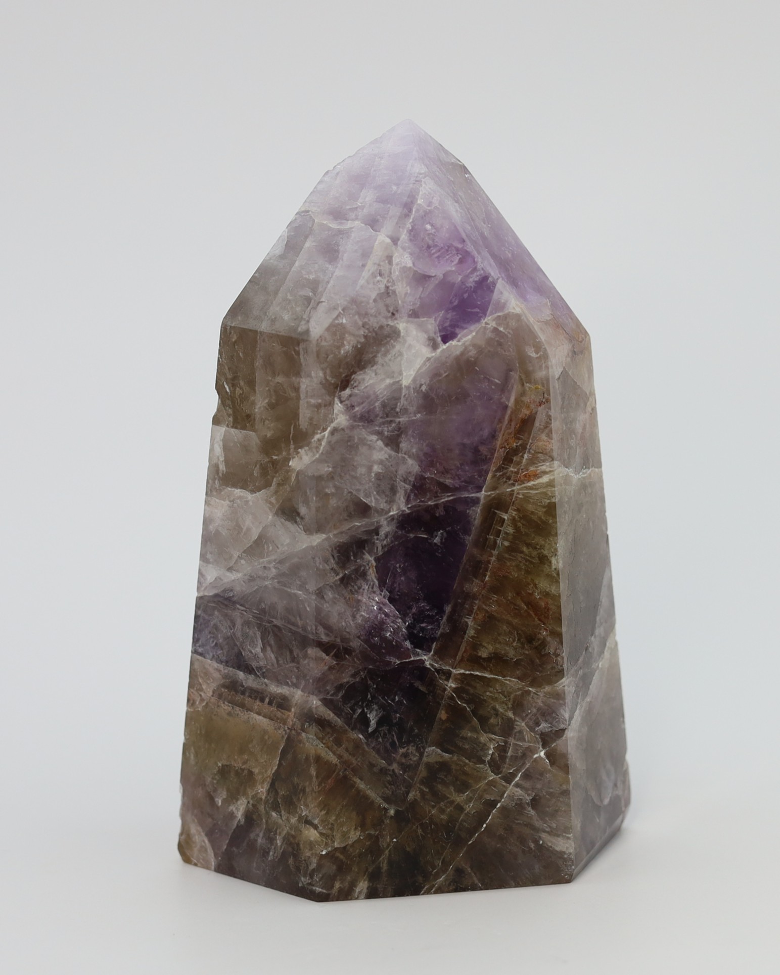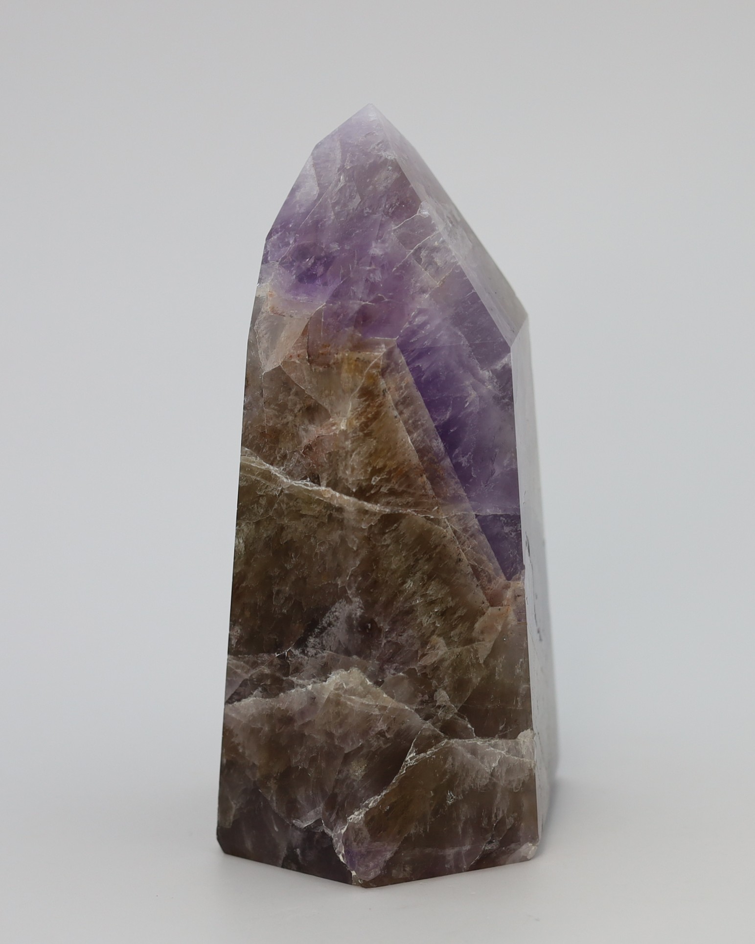 De paarse en rokerige zones ontstaan doordat kleine variaties in ijzer en natuurlijke straling tijdens de groei verschillende kleurvormen van kwarts in hetzelfde kristal laten ontstaan. Daardoor kunnen amethist en rookkwarts in elkaar overlopen terwijl het nog steeds één enkel kristal blijft. De hoeveelheid en zichtbaarheid van de insluitsels verschilt per groeifase, waardoor sommige exemplaren helder lijken en andere juist rijk gevuld zijn.