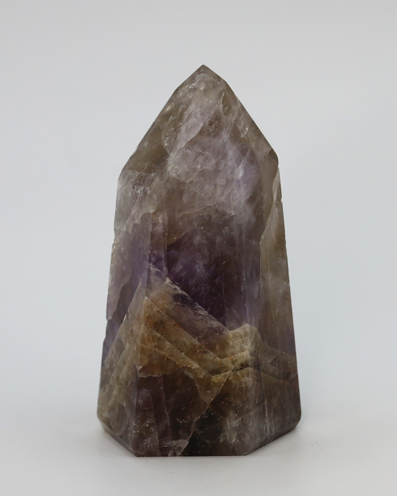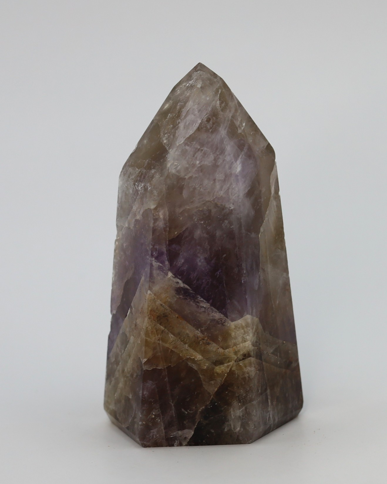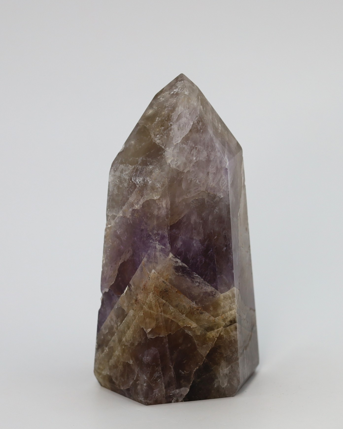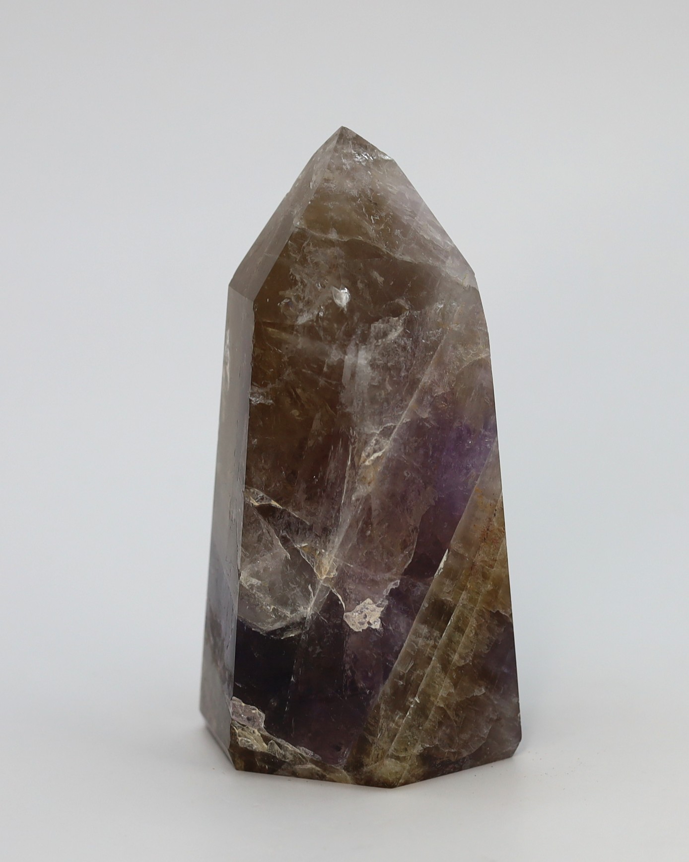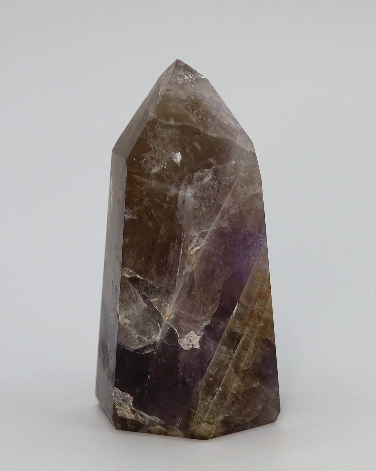 De paarse en rokerige zones ontstaan doordat kleine variaties in ijzer en natuurlijke straling tijdens de groei verschillende kleurvormen van kwarts in hetzelfde kristal laten ontstaan. Daardoor kunnen amethist en rookkwarts in elkaar overlopen terwijl het nog steeds één enkel kristal blijft. De hoeveelheid en zichtbaarheid van de insluitsels verschilt per groeifase, waardoor sommige exemplaren helder lijken en andere juist rijk gevuld zijn.